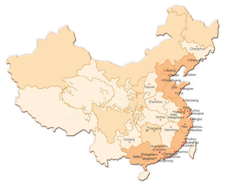 Zhejiang Province: Hangzhou, Ningbo, Taizhou, Wenzhou, Yiwu, Huzhou,Fujian Province: Xiamen, Zhangzhou, Quanzhou, Fuzhou